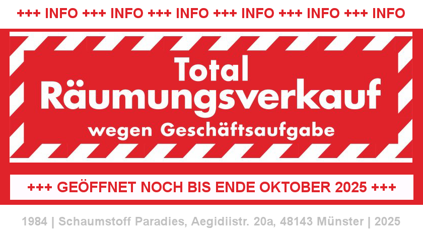 Aus wirtschaftlichen Gründen haben wir uns Anfang des Jahres dazu entschlossen, dass Schaumstoff Paradies Ende Oktober 2025 zu schließen. Nach über 40 Jahren in Münster! Leider 🙁 Der Räumungsverkauf läuft noch bis Ende Oktober. Vielen Dank an alle Kunden und Lieferanten für viele schöne Jahre!